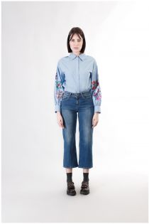 Super stretch canvas denim jeans with a culotte fit. loops at the waist five pockets logoed tack button and zip closure. label on the back with logo.