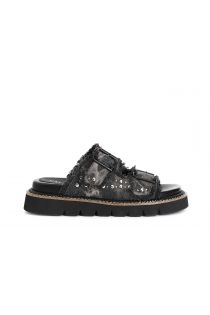 Denim fabric slipper with double buckle. the upper is enriched with studs and rhinestones. the wedge is 2.9 cm high. a shoe that combines style practicality and versatility. perfect footwear for summer to wear with long wide skirts.