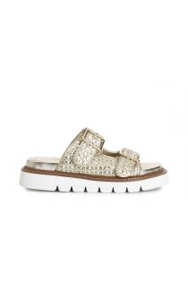 Woven slipper with double buckle. the wedge is 2.9 cm high. a shoe that combines style practicality and versatility. perfect footwear for summer to wear with long wide skirts.