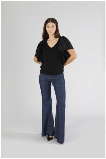 dual-material t-shirt with ruffles at the shoulders black