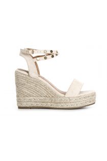 Fabric sandals on a cord wedge and platform. ankle strap with gold studs.