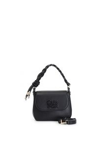 flap with braided handle and tone-on-tone rectangular logo black