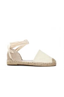 Sandals in multicolour canvas fabric, with visible stitching between the upper and the sole. Closed toe, closed heel, with double grosgrain gladiator laces.