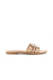 Flat leather slide sandals with a bold front band embellished with decorative pearls and a jeweled buckle. the leather insole and 1.4 cm high sole ensure comfort and style for sophisticated summer looks. summer at your feet.