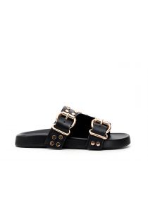 Flat sandals with faux leather fusbett, striped textured sole and welt with studs. A play on flowers intersected by rivets that create a patchwork of real pony hair with zebra print or leopard print with faux leather.