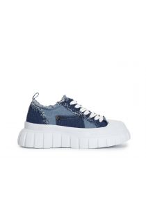 Lace-up sneakers in frayed multi denim fabric. the rubber toe decorates the shoe. 55mm raised sole decorated with a striped pattern.