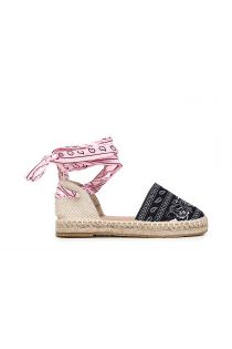 Pattern fabric sandals, ankle strap in the same pattern with different colour on low cord platform