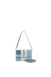 Frayed patchwork denim shoulder bag with flap. metal logo with rhinestones. bag with shoulder strap.