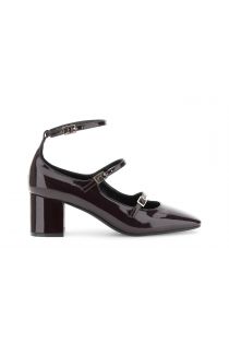 Glamorous patent leather pumps with three straps and gold buckles. Leather insole for extra comfort. A 5.8 cm block heel for a retro-inspired elegance.