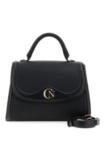 Elegant grainy faux leather handbag with a flap and padded frame. Metal café logo and removable shoulder strap with gold-tone snap hooks.