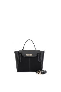 Handbag with flap in grainy material and suede effect on the front. metal logo plate and knot detail on the front of the bag. magnetic closure. removable shoulder strap.