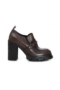 High-heeled leather moccasins with studded loop. Rubber platform decorated with a pattern evoking the world of sport.