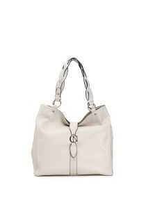 Hobo bag embellished by metal clasp with CN logo and double handle moulded into a wide braid shape