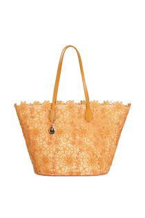 Lace shopping bag with fabric lining leather-effect handles and metal charm with chain. refined elegance and ideal capacity for casual and chic looks