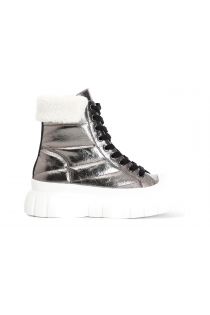 Sporty lace-up ankle boot in patent fabric with quilted padding. this is enhanced by a faux fur collar. perfect footwear for cold winter days. raised sole featuring a distinctive striped pattern.