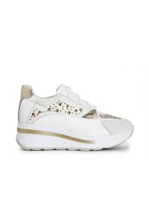 Leather sneakers with heat-sealed rhinestone pattern on the front and side feature. 40mm two-tone wedge sole with embossed logo.
