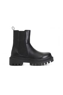 Women's leather ankle boot with side stretch panel. leather insole. rubber lug sole and 40mm heel.