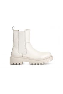 Women's leather ankle boot with side stretch panel. leather insole. rubber lug sole and 40mm heel.
