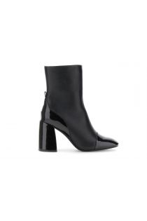 Leather ankle boots with shiny patent leather inserts, perfect for a sophisticated and glamorous look. A leather insole and sculptural 8.5 cm heel add a touch of style.