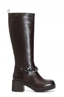 Leather boots with square heel and rubber sole, decorated with a wide metal chain serving as an ankle strap