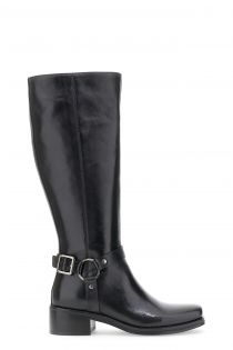 Leather boots with side spurs and a strap. Leather insole for superior comfort. 18-inch heel for a bold style and contemporary design.
