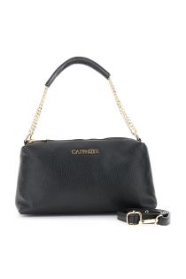 Hammered leather camera bag with chain handle and matching shoulder strap. Features a removable shoulder strap with snap hooks and a metal logo on the front. Ideal for any look.
