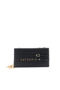 Leather-look wallet with two compartments, one with a flap and one with a zip, decorated with lettering stripes and a buckle. Detachable chain shoulder strap.