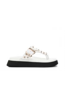 Leather flip flops with buckle decorated with maxi faceted square studs, comfortable footbed and high sole.