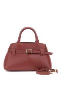 Leather handbag with decorative strap and front buckle, discreet embossed logo, and removable shoulder strap. Compact elegance for sophisticated everyday looks.