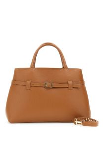 Hammered leather handbag with strap and decorative buckle, embossed logo on the front, and removable shoulder strap. Elegant and versatile, perfect for any occasion.
