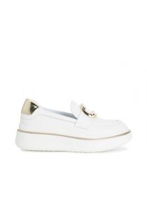 Women's moccasin in covered leather with 3 cm platform. shoe embellished with jewel clamp. round tip. internal footbed. 4.5 cm high sole. footwear that accompanies your days with comfort and fashion