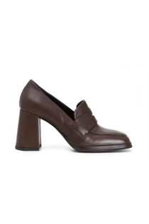 Leather moccasins with medium heels and square toe in a contrasting colour.