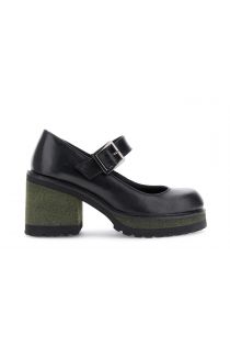 Black leather pumps with adjustable strap and buckle. Treaded sole and 9 cm contrasting block heel. Leather lining and insole. Bold and contemporary design.