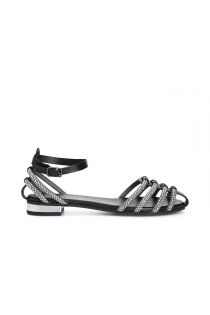 Leather cage sandals with microrhinestone decoration and patch on the back. lining and insole are in leather. the heel is 2 cm.