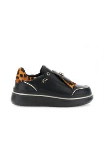 Leather slip-ons with spotted pony-effect leather fringe detail and jeweled accessory. Side logo with Café Noir monogram. Fabric lining and leather insole. 4 cm platform sole for a glamorous and comfortable style.
