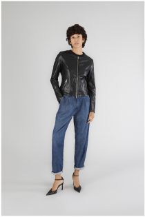 Crew-neck jacket made of imitation leather with elastic fabric inserts to increase comfort. central zipper. basic line that gives elegance and simplicity.