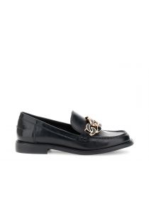 Black loafers with a metal clip made of faux leather. They feature a leather insole and a low 2 cm heel. Elegant and versatile, they're perfect for refined looks.