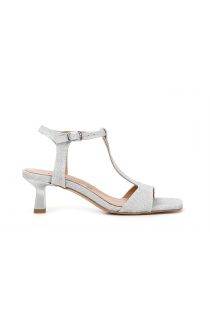 Sandals with square toe and 50 heel, lurex fabric upper, leather insole and lining.
