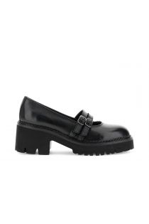 Mary Jane-style leather pumps with adjustable double straps. Leather lining and insole, lug sole, and 6.3 cm heel. Bold and feminine design for bold, urban looks.