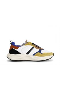 Multicolour men’s running shoes in leather and fabric with a new sole characterised by an interplay of hollows that make the shoe unique.