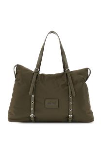 Soft, padded nylon shopping bag with a relaxed fit, featuring adjustable straps with buckles and eyelets. A front plaque with lettering adds an urban-chic touch.