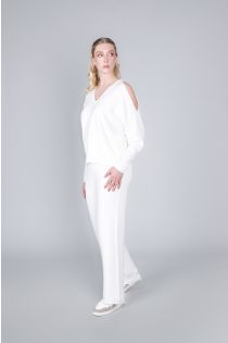 Oversized off-the-shoulder sweater with a V-neckline made of soft viscose blend yarn. Casual, comfortable fit for a modern and versatile look. The model is 174 cm tall and wears a size S.