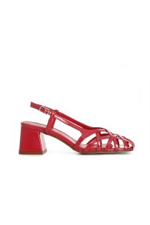 Open patent leather shoes with asymmetrical woven cage. rounded shoe shape. lace at the back. 45mm-high heel. very comfortable perfect for everyday use.