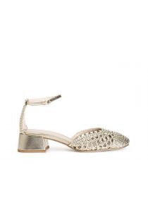 Open shank décolleté in woven laminate closed at the back with a patch and ankle strap. leather insole. shoe with a rounded shape. a mix between a moccasin and a pump. wide heel h. 4 cm. very comfortable perfect for everyday use.