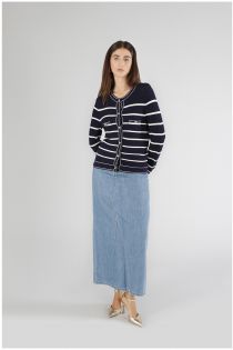 Striped cardigan with perforated pattern made of viscose yarn. long sleeves and button closure. essential and versatile garment for the spring season.