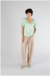 Short-sleeved blouse with an oversized fit made of viscose satin. detail with rib and lurex to finish the "v" neckline. the blouse is perfect as an under-jacket to combine with suits and suits.