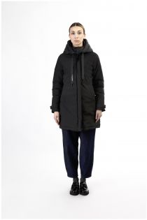 Padded jacket made of technical fabric with detachable hood in contrasting fabric. printed nylon lining with our "be noir" slogan. inside there is a practical strap made of logoed jacquard ribbon which allows you to wear the garment like a backpack on the hottest days.