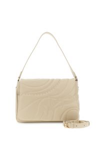 Quilted and padded faux leather flap bag with decorative rivets. Short shoulder strap and removable shoulder strap with metal snap hooks.