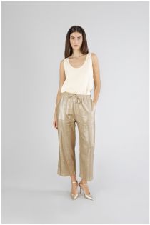 Palazzo trousers with elasticated waist in plated mixed-line fabric. fresh and versatile garment perfect for informal occasions this spring-summer.