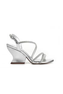 Asymmetrical patent sandals with rhinestones. the 80mm-high wedge heel is original and comfortable.